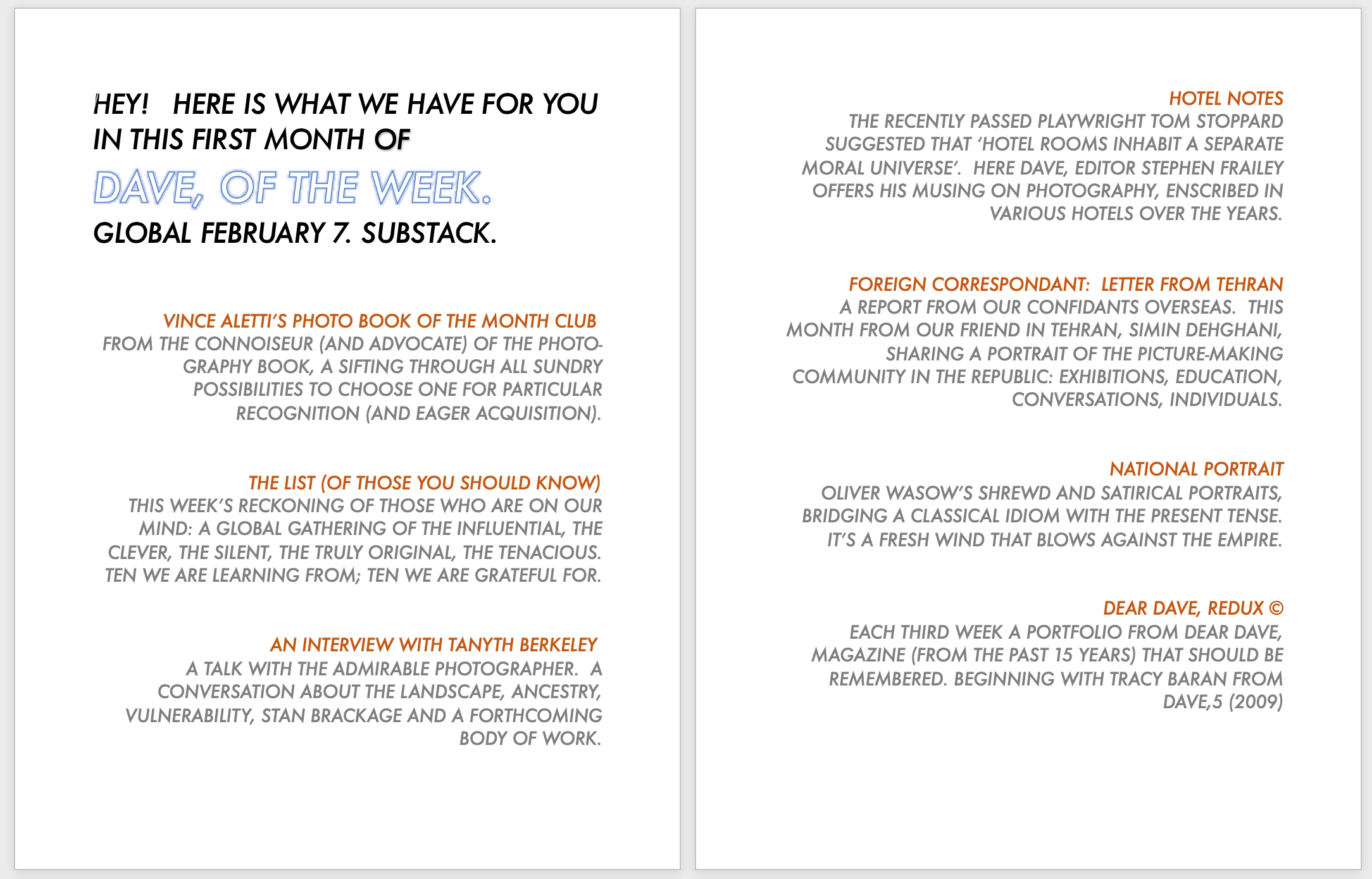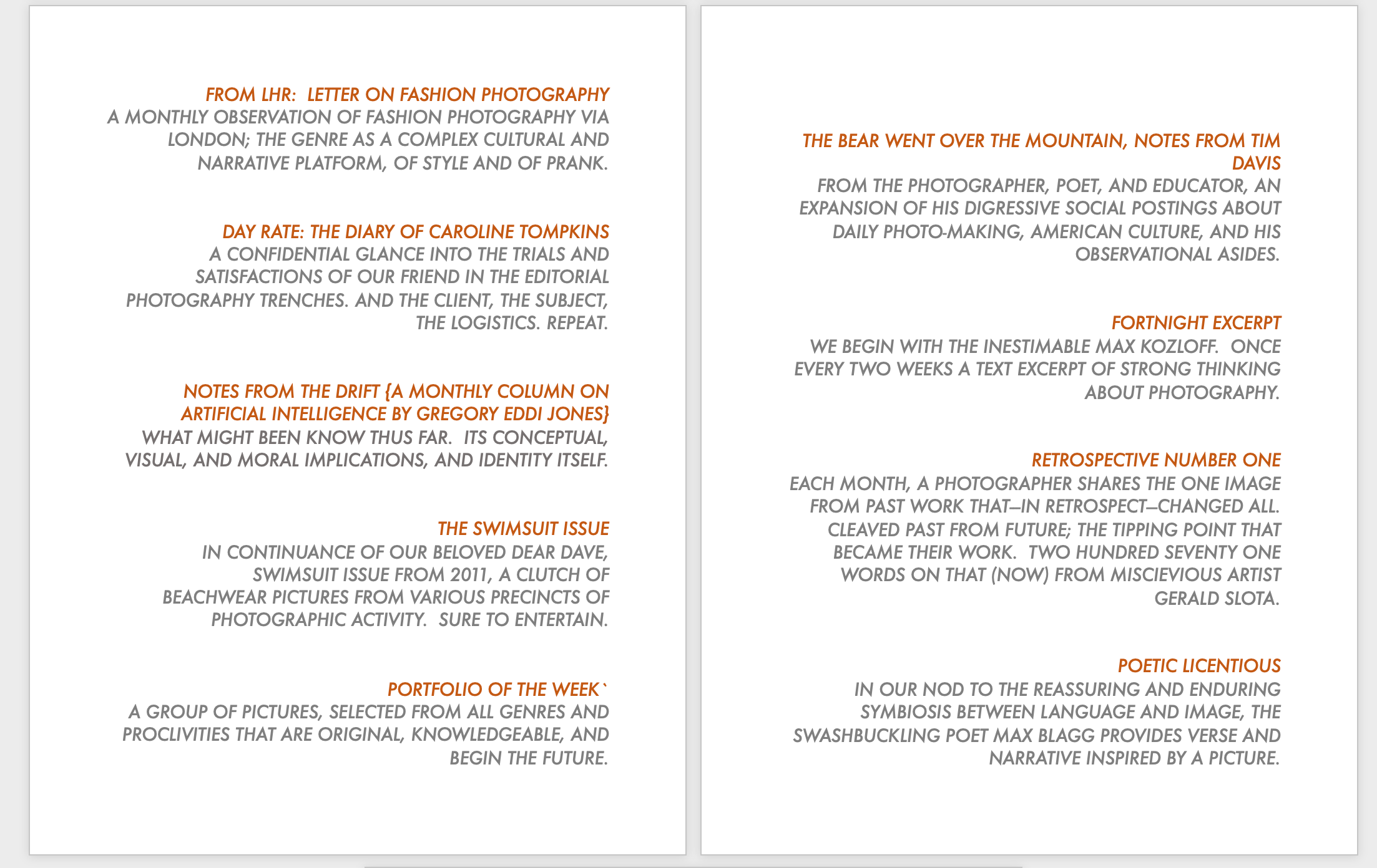 A WEEKLY NEWSLETTER OF PHOTOGRAPHY: OPINIONS, ESSAYS, INTERVIEWS, LISTS, LETTERS, POEMS AND PORTFOLIOS, OF BOTH HIGH GRAVITY AND MIRTH, AVAILABLE EACH SATURDAY MORNING IN YOUR MAILBOX. INFORMATION, SPECULATION, OPINION, PICTURES.